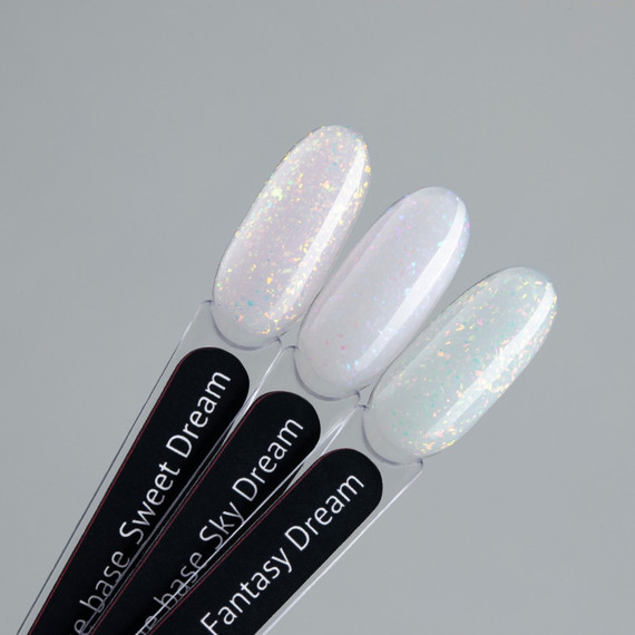 Выравнивая ногтевую пластину, камуфлирующие базы выполняют свою основную задачу и одновременно создают финишное покрытие. Кусочки голографической потали придают каждому оттенку интересные разноцветные блики, оставаясь при этом неброскими, нежными.