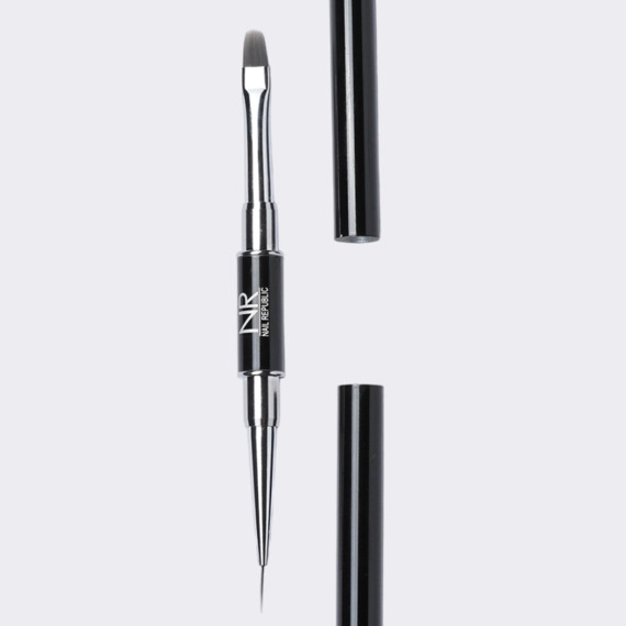 С одной стороны — плоская кисть-лепесток с закругленными краями. Таким инструментом удобно наносить и выравнивать гель. С другой стороны — кисть-волосок для детальной проработки труднодоступных мест.