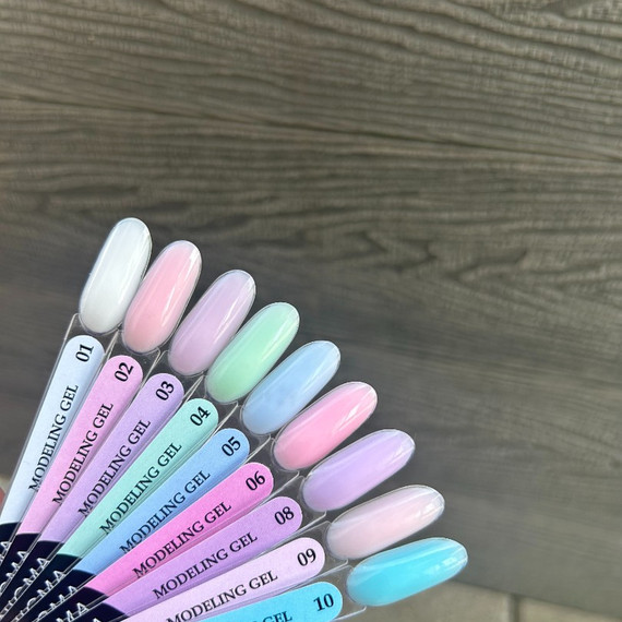 Modeling gel гели для наращивания, коллекция из 10 цветов. Гели средней кремовой консистенции, очень послушны в работе. Гель в тонком слое пластичный, что позволяет избежать отслоек, в толстом слое крепкий и твёрдый. Имеет минимальный тепловой эффект.
