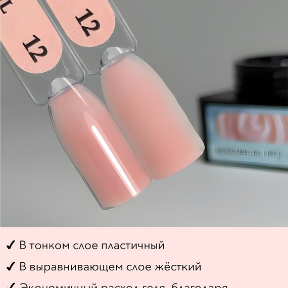 Modeling gel гели для наращивания, коллекция из 10 цветов. Гели средней кремовой консистенции, очень послушны в работе. Гель в тонком слое пластичный, что позволяет избежать отслоек, в толстом слое крепкий и твёрдый. Имеет минимальный тепловой эффект.