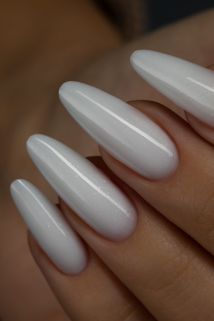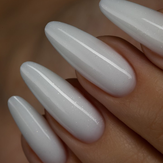 Гель Monami для наращивания, белого оттенка, с шиммером. Средняя консистенция, цвет более прозрачный с добавлением мелкого шиммера серебристого цвета. Равномерный, без крупинок, после просушки цвет не