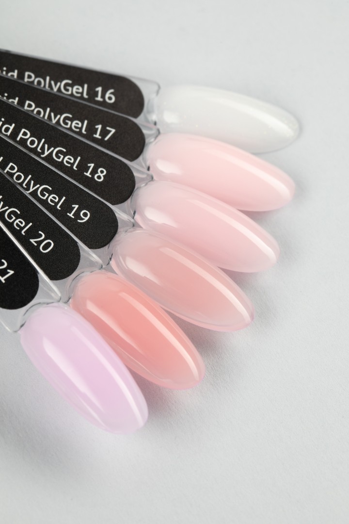 Жидкий полигель Liquid Polygel в молочном цвете с шиммером -  это универсальный продукт, который наносится как база, но твердый как гель. После полимеризации имеет минимальную остаточную липкость. Инновационный материал для укрепления, выравнивания и донаращивания ногтей.