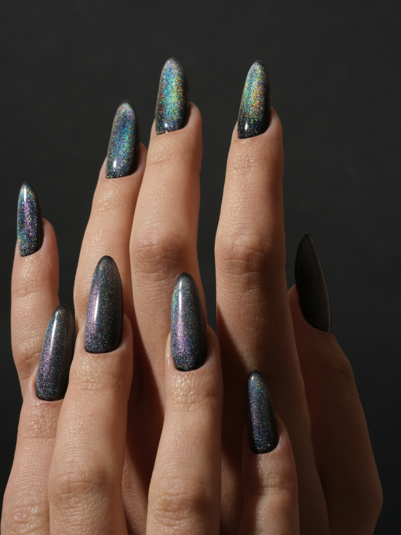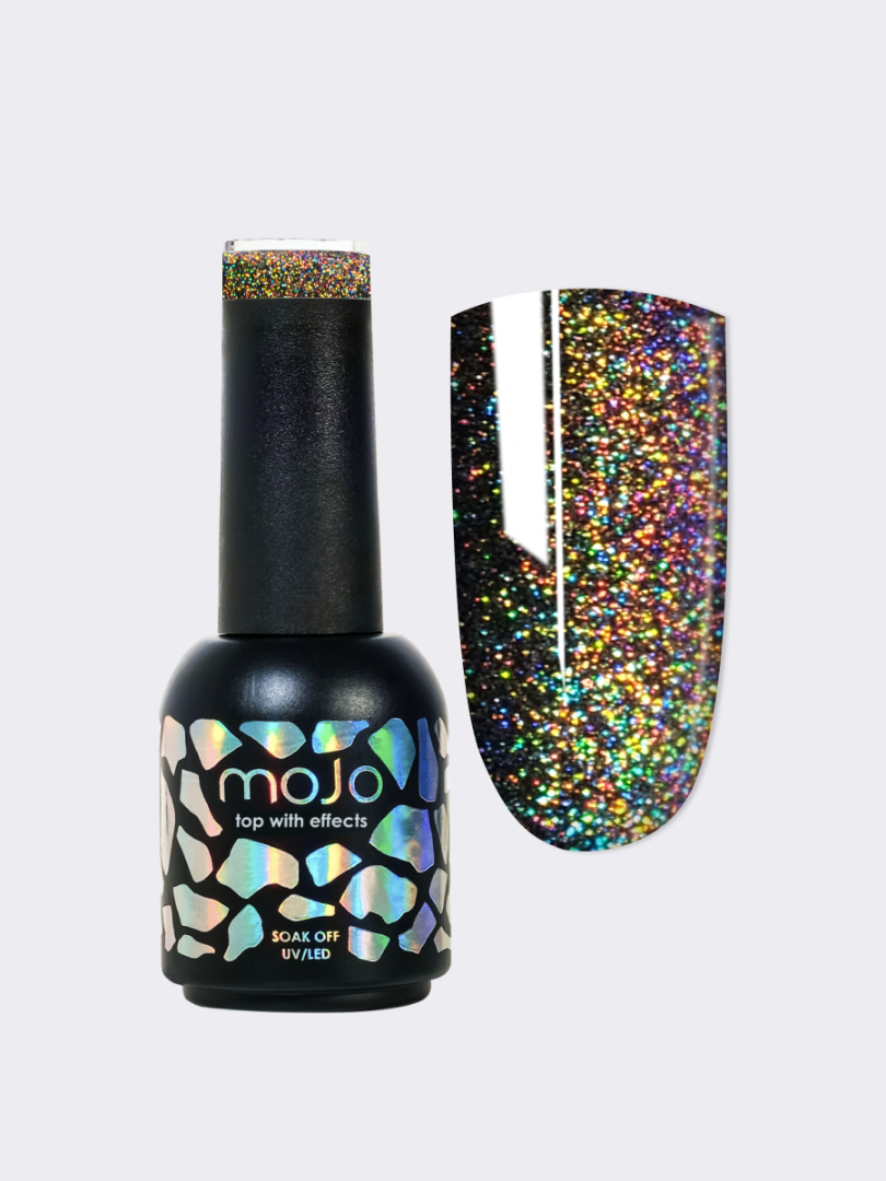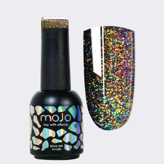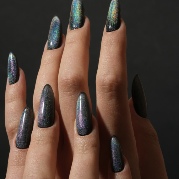 Топ переливается всеми цветами радуги, создает непередаваемое сияние на ногтях. Металлические частицы в составе создают ярко выраженный эффект призмы, легко магнитятся.