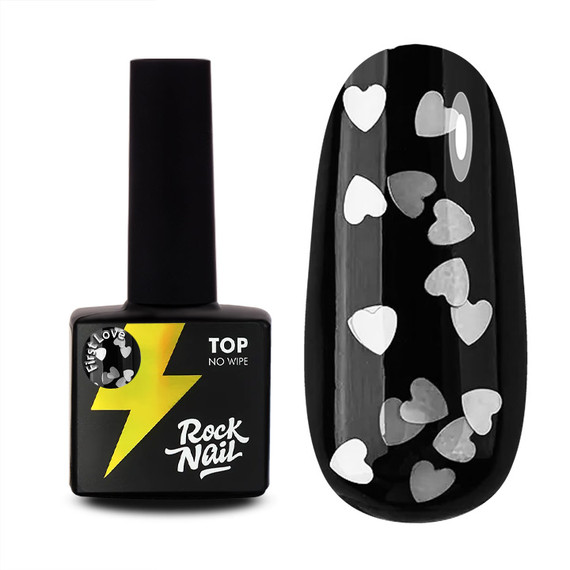 Топ RockNail — это ослепительное сияние, стойкий глянцевый финиш и россыпь черного глиттера в форме сердечек.